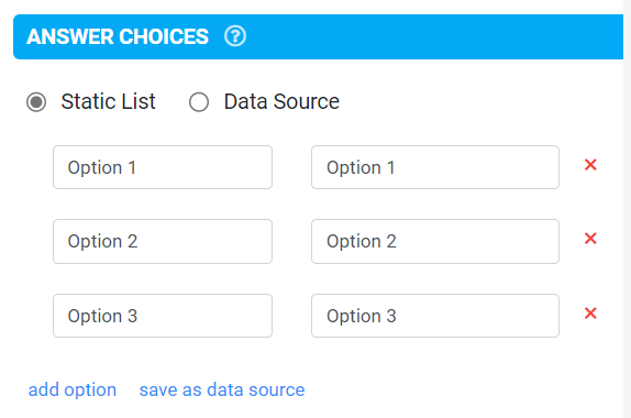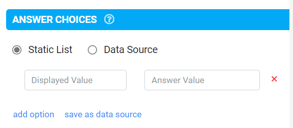 A Static List allows for options to be manually entered. Each option requires a Displayed Value and Answer Value.