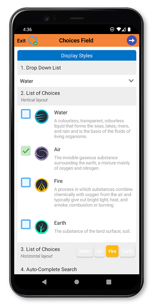 Depending on your display requirements, the Choices field's display type property controls how options added to the field are displayed in-app. The following display types are available.