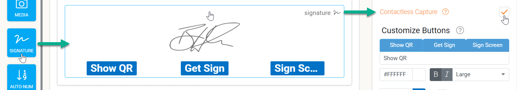The Show QR, Get Sign, and Sign Screen buttons are core options to configure for the contactless signature field.