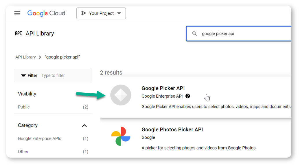 - In the search box, type Google Picker API, select the option, and enable it.